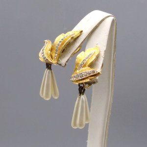 Vintage Vendome Brushed Leaf Earrings with Elongated Teardrop Pearl Dangles, Crystal Channel on Autumn Leaves, Fall Coordinate Elegant Bride