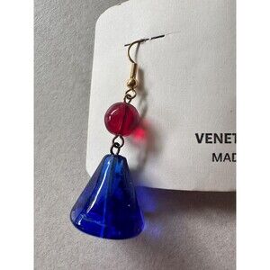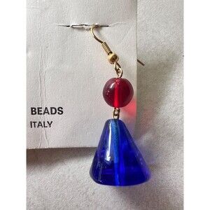 Add a touch of Italian artistry to your jewelry collection with these stunning vintage Venetian bead earrings, crafted in Italy. Each earring features a deep red round bead paired with a vibrant cobalt blue conical glass bead, hand-formed in the centuries-old Murano glassmaking tradition.