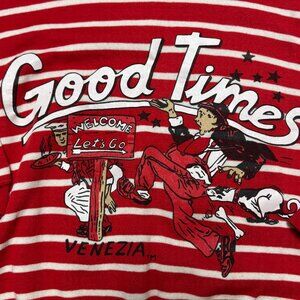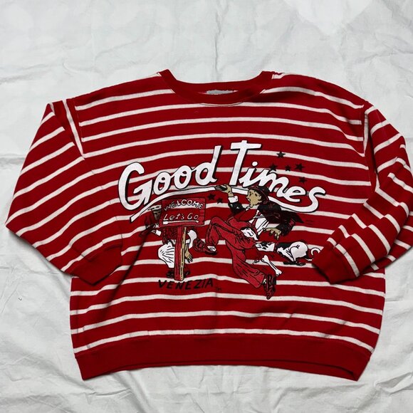Original Venezia Sportswear crewneck sweatshirt. Red with white stripes. "Good Times" in white with black drop shadow font. Graphic shows a man with a hamburger and a dog with a bone, running toward a chef crouching behind a sign post with the phrase "Welcome Let's Go." Chef is holding a steaming hot pie or pizza. There's a lot of charming tomfoolery going on here.
