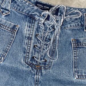 Vintage Venezia denim jean shorts featuring a lace-up front detail and classic medium-wash denim. Flattering high-rise style with functional front pockets and a structured fit. A true Y2K-inspired piece that pairs well with tanks, graphic tees, or cropped tops for casual summer wear.