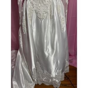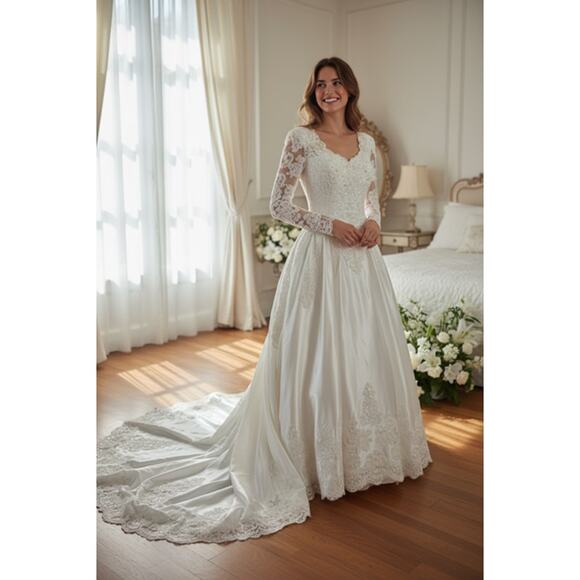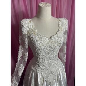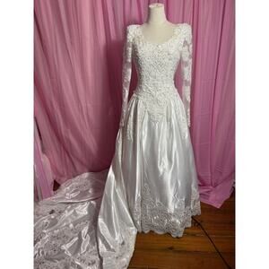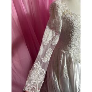 Capture timeless elegance with this vintage Venus wedding dress! This stunning gown features long sleeves and a detachable train, offering versatility for your special day. It is a size 10W.