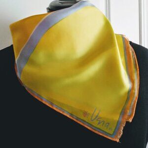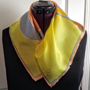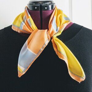 Vintage square scarf with abstract print by Vera in two shades of golden yellow, melon orange and light dusty blue.