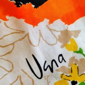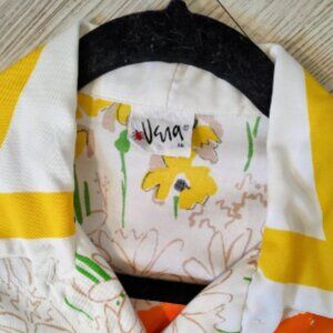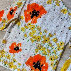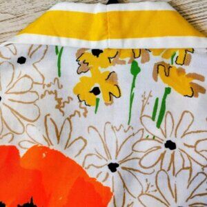 Striking floral patterns in orange, yellow, and black on a white base. A small fixable tear and small stain on one pit (last two pics) but at this price you gotta get your Vintage Vera on! 21" pit to pit. 25' shoulder to hem.