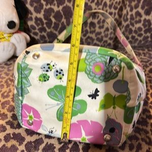 Print is on a cream base with butterflies, Beatles, bees, and flowers