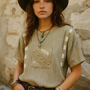 Vintage Vera Cristina Avant Garde Shirt – 100% Cotton Textured Top with Label Patchwork, Made in USA, Size M
