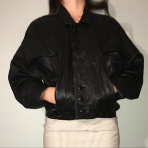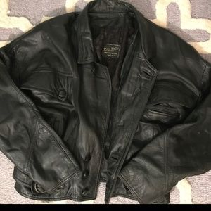 Leather is really soft, and has been well-loved but is in great condition. The inside is a soft paisley silk with hints of purple. Note that is's modeled on a size small model, but is a size large. The only thing is it's missing a button on the upper left pocket, which isn't very noticeable.