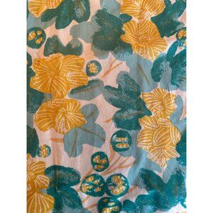 This vintage Una scarf showcases a vibrant floral print in teal and yellow on a cream background. Lightweight and versatile for various wardrobe styles.
