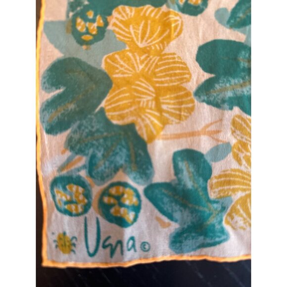 This vintage Una scarf showcases a vibrant floral print in teal and yellow on a cream background. Lightweight and versatile for various wardrobe styles.