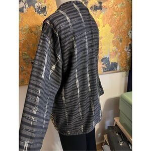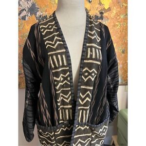 Medium-weight woven cotton Ikat stripe and batik print with two giant front pockets. This has a nothing-matching feeling and is soft and broken with an open front. Wear this to the opera or the grocery store!