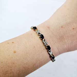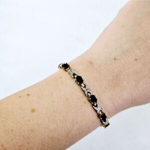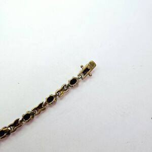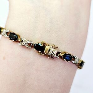 Wonderful vermeil Sterling Silver vintage tennis bracelet that is marked is 925 on the clasp. Vermeil is made by coating a base of sterling silver with a thin layer of gold, which is why this tennis bracelet has a gold appearance. This classic retro bracelet has 12 dark blue faceted stones that are set with prongs between silver crossing links. The stones may be Topaz but I cannot be sure. The bracelet has an intricate box closure with security clip. It is a truly beautiful piece. There is some wear on the gold plate. Measures 7" long.