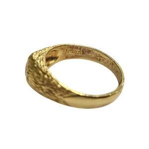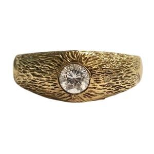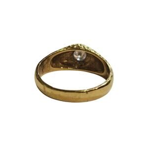 This elegant vintage ring features a single, brilliant cubic zirconia solitaire that captures and reflects light beautifully, mimicking the sparkle of a genuine diamond. The stone measures 5mm wide and is set in a vermeil sterling silver mounting, a style that was very popular in the late 20th century. Vermeil is sterling silver that has been plated with a layer of gold, providing the warm luster of gold with the durability of silver.