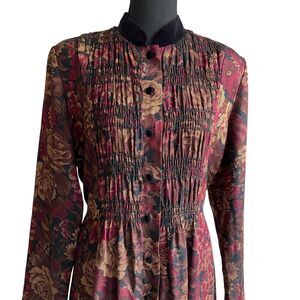 Midi dress, stand neck, front button, smocked front, long sleeve, floral, belted, flared skirt.