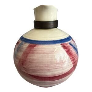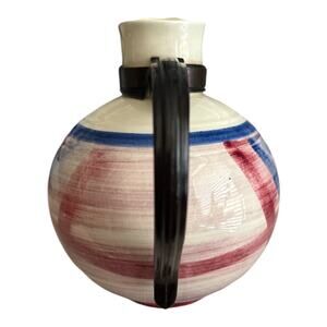 Very good preowned condition with no cracks or chips Vernon Kilns ewer, pitcher, pot is a creepy white with red white and blue plaid hand painted. The plastic handle is flawless and still firmly attached by a metal ring and screws. Adorable bulbus round pot con serve any of your favorite drinks. Please examine photos closely. The last one shows a small discoloration which is part of the kiln process.This piece does not have the lid.