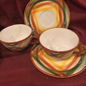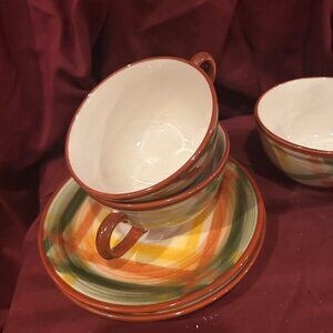 Vintage Veronware Homespun Cup & Saucer green, rust, yellow plaid design, set serving 4