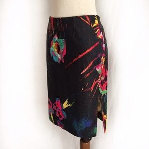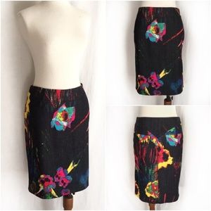 Electric and abstract vibrant flowers on a black stretch denim pencil skirt