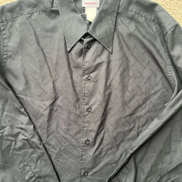 Stylish black button-up shirt by Versace Classic. Features subtle pattern detailing.