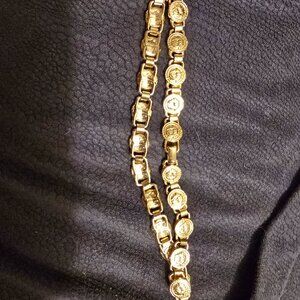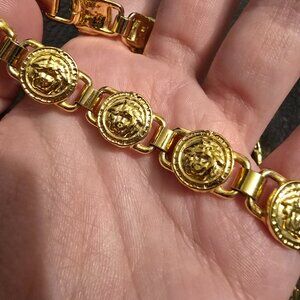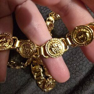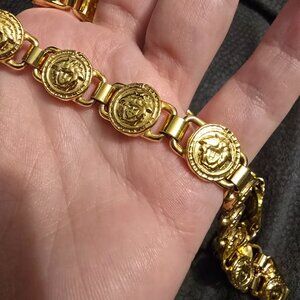 Vintage Gianni Versace chain choker/necklace, a statement piece showcasing the brand's iconic Medusa head motif. This eye-catching item features a series of 22 circular medallions, each adorned with the Medusa emblem, linked together to form a continuous chain. The design exudes luxury and boldness, characteristic of Versace's aesthetic. The choker is secured with a clasp closure. It's in excellent condition with no wear on the gold plating.