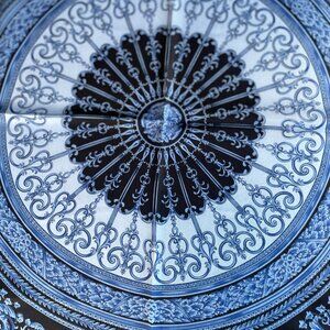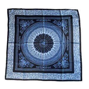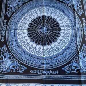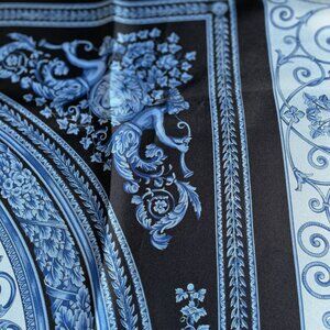 This luxurious vintage Versace silk scarf features an opulent Baroque-style design in striking shades of blue and black. Known for their bold aesthetic, Versace's accessories often highlight rich patterns and ornate detailing, and this piece is no exception.