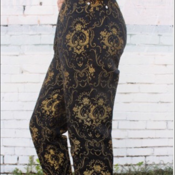 Italian size: 44 US size: 10 - rare black Versace pants with intricate gold threading throughout.