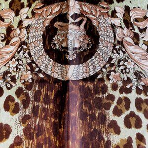 Design: Central leopard motif with ornate floral scrolls, coins, and classical medallions