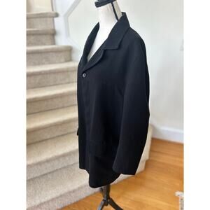 Very good condition, minor residue on one pocket, not at all noticeable. Classic black, button front, oversize front pockets. Thick knit material.