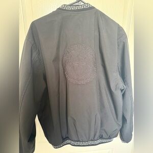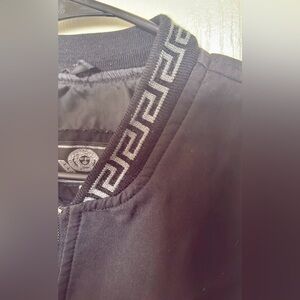 Embroidered Versace logo on front left and large on back center. Greca pattern on wrists, neck, and bottom of jacket.