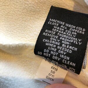 Jacket is off white, light cream / ivory with black studded zipper pulls