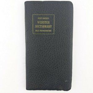 Vest pocket Webster Dictionary. This vintage item shows some wear normal for age and use. There is writing on inside of front and back cover pages, some minor edge and corner wear, and some blue ink/discoloration on back inside cover and last two pages. There are what look to be water marks on some upper edges of pages, but no damage other than the marks. No pages stuck together. No writing on inside pages.