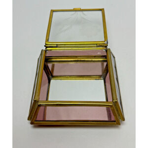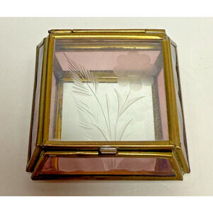 Vintage Via Vermont Tinted Purple Pink Glass Jewelry Trinket Box Casket Brass Floral Etched design on top. Great condition. Light wear. No chips, no cracks. Mirror in bottom. Original label. Made in Mexico. 1.25" tall x 3" x 3".