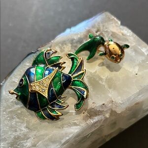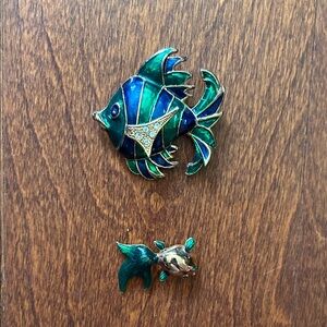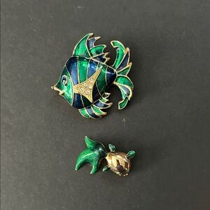 Enhance your style with this vintage fish brooch set. Featuring striking blue and gold hues, these brooches add a unique flair to any ensemble.