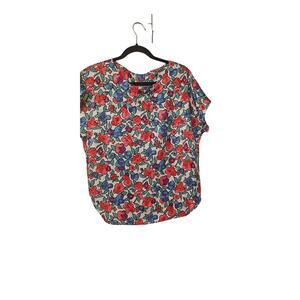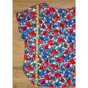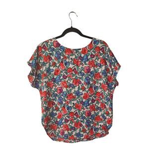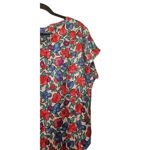 A vibrant vintage top featuring bold floral patterns in red, purple, and blue on a white background. With a relaxed fit and rounded hem, it’s perfect for casual, retro-inspired looks.