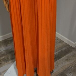 Stunning orange maxi dress with delicate lace trim. Ideal for elegant occasions.