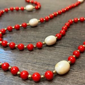 Vintage Vibrant Red Gold Tone and Cream Long Beaded Necklace