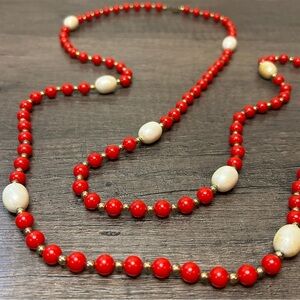This striking vintage necklace features a vibrant red with smooth, glossy beads, complemented by larger creamy off-white and gold tone accent beads. Its long design allows for versatile styling, whether worn as a single strand or wrapped for a layered look.