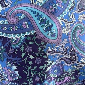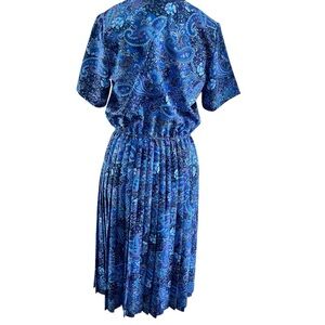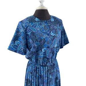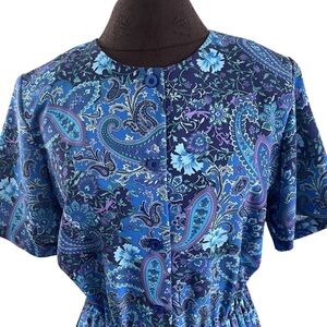 This dress is an excellent unworn condition pristine. Fun blue paisley print. Button bought us with round neckline and pleated ski skirt. Elastic waist. Add your own belt. Short sleeves. Easy care polyester. Made in the United States. Probably circa 1980 to 1985. Measurements are provided in the photographs. It seems slightly oversized so could fit a large. Please look at the photographs and know your size.