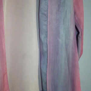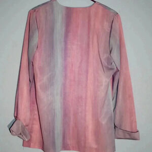 This colorful pastel open front blazer has the original shoulder pads still intact. It is made of 100% polyester and was created for the Signature Collection by Vicki Wayne. Looks like a watercolor painting with the pinks, blues, and purples. Size 10 and in wonderful shape for it's age!