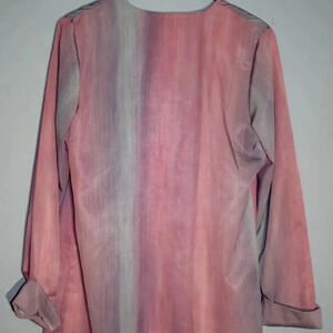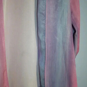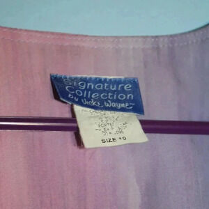 This colorful pastel open front blazer has the original shoulder pads still intact. It is made of 100% polyester and was created for the Signature Collection by Vicki Wayne. Looks like a watercolor painting with the pinks, blues, and purples. Size 10 and in wonderful shape for it's age!