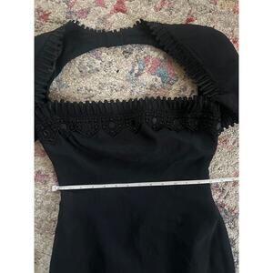 Elegant vintage Victor Costa black dress featuring a sculpted neckline with delicate lace trim and an attached bolero-style overlay. This creates a cutout effect for both the front and the back. Designed with short sleeves, softly scalloped edges, and a beautifully tailored knee-length silhouette that defines the waist and skims the hips.