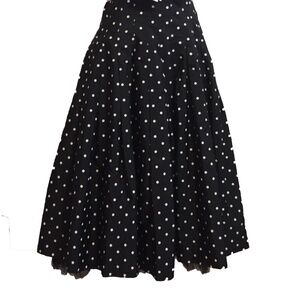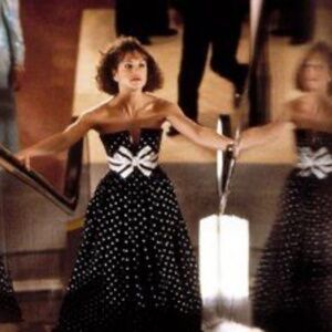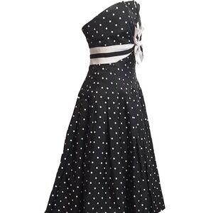 Victor Costa vintage dress, circa 1986, worn by Penelope Cruz in 2004 at the "Head in the Clouds" premier at the Toronto Film Festival, and by Holly Hunter in the film "Broadcast News," 1987. Black strapless dress with white dots and white and black striped belt at empire waist and large bow embellishment. Hits below the knee. Neckline can be folded down to form a "V" or up. Includes a separate black underlay with lace trim.
