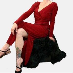 Stunning vintage Victor Costa floor length red shimmery sparkle gown with long sleeves, a wrap style v- neckline, a slightly gathered waistline for a figure flattering shape and slit at side. Back zipper closure, fully lined.
