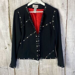 Gorgeous unique jacket with rivet detailing. Hook and eye closure. Beautiful red satin lining. No holes, stains or snags. Smoke free home. Bundle and save! Check out my 5 star reviews! Fast and careful shipping!
