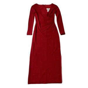Stunning vintage Victor Costa floor length red shimmery sparkle gown with long sleeves, a wrap style v- neckline, a slightly gathered waistline for a figure flattering shape and slit at side. Back zipper closure, fully lined.