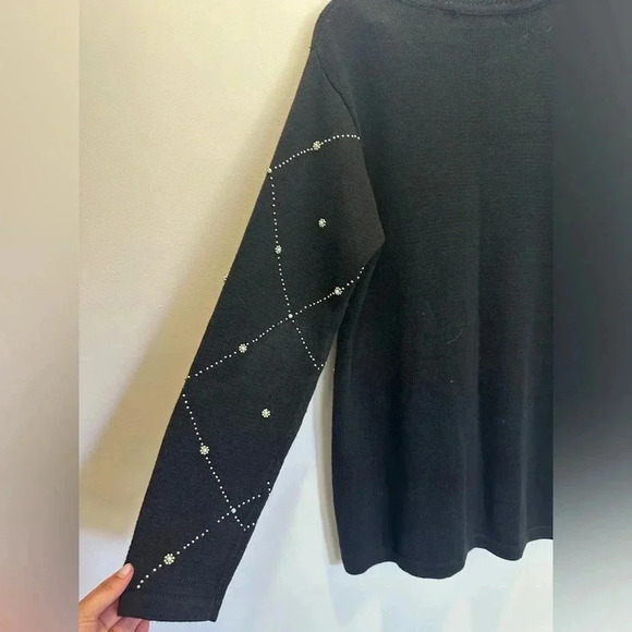 Black background cotton ramie blend pullover longsleeve ugly Christmas sweater, mock turtleneck collar with embroidered flowers & beaded poinsettias in a argyle pattern on the front. Plain black on back. Tall or oversized long fit.