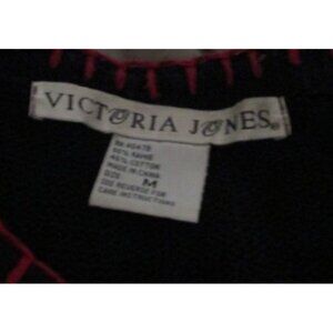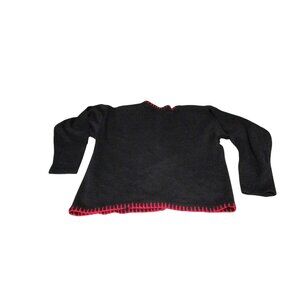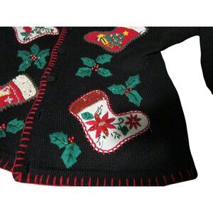This Victoria Jones sweater invites you to embrace the whimsical spirit of the holidays. Adorned with festive stocking and holly appliques, it radiates cheer. The intricate red stitching offers a lovely contrast against the black fabric, adding a touch of elegance. Although the bottom two buttons are missing, this sweater remains a charming and cozy choice for celebrating the season.