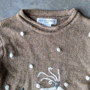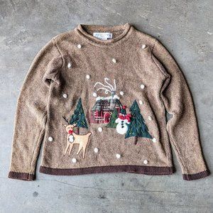 Vintage Victoria Jones Petite Brown Christmas Winter Snowman Reindeer Sweater