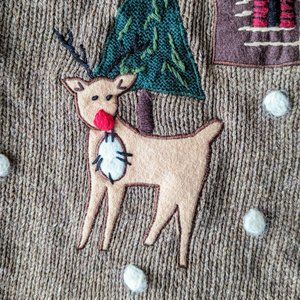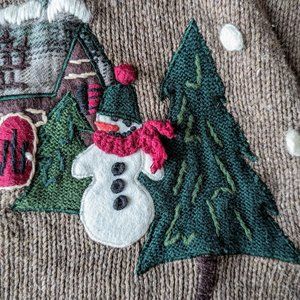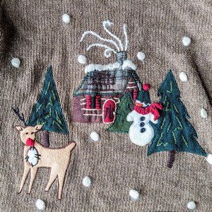 Victoria Jones Petite sweater, size small petite, in great vintage condition! Brown knit with a fun Christmas-y winter scene featuring a cabin, snowman, reindeer, pine trees, and snowballs. Roll neck neckline and full length sleeves. The snowballs have feathery wisps on them, I think from wear and wash. 19" pit to pit, 23" length. 52% ramie, 19% acrylic, 17% nylon, 12% wool. No trades. No modeling. Make a reasonable offer. Thanks!