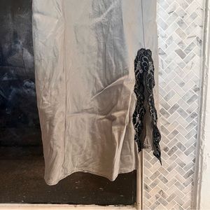 Vintage Victoria Secret. Silver/grey 100% silk slip dress. Black lace details. Slit on thigh. Size S