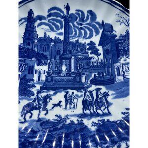 This decorative plate showcases a detailed scenic design in blue and white tones, crafted from durable ironstone. Its classic aesthetic complements traditional interiors.