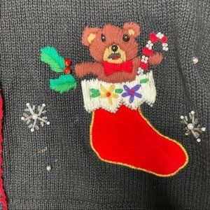 Vintage Victoria jones beaded and sequin Christmas sweater with terrified teddy . “ ugly Christmas sweater “