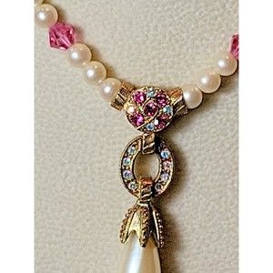 What a precious dainty necklace in cream colored faux pearls, pink and blue faceted crystals